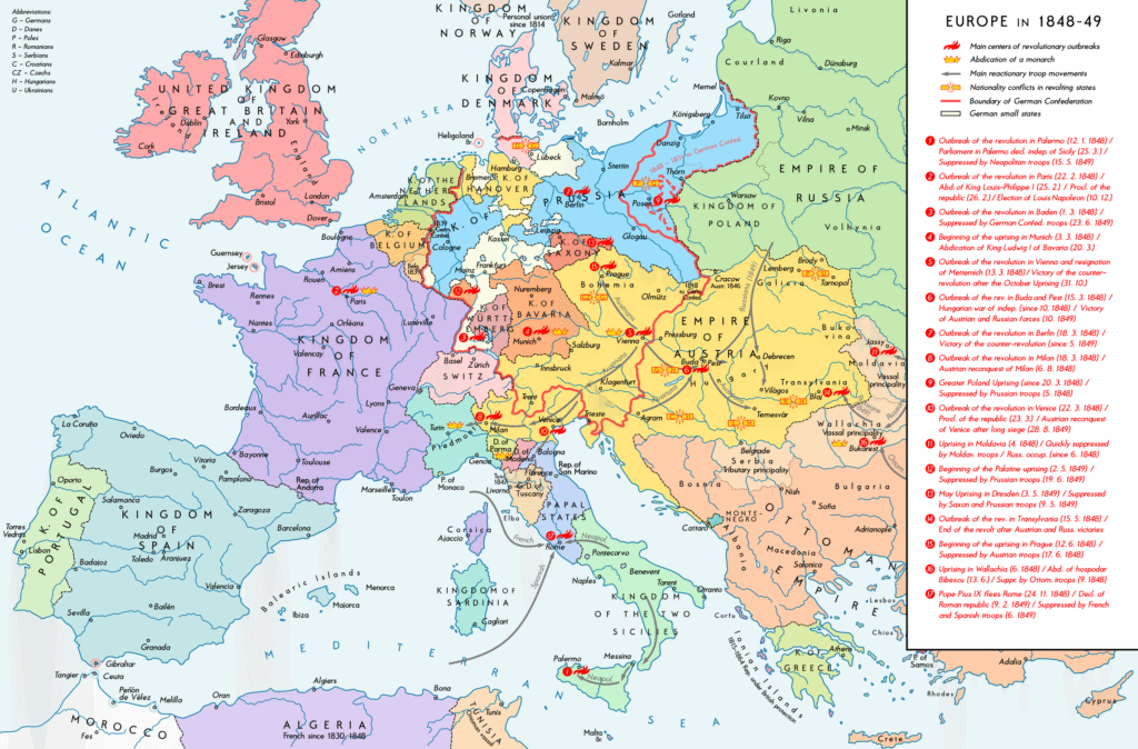 Mapa histórico com os principais centros revolucionários, movimentos importantes de tropas reacionárias, Estados com abdicações e conflitos nacionais. (Wikimedia Commons.)