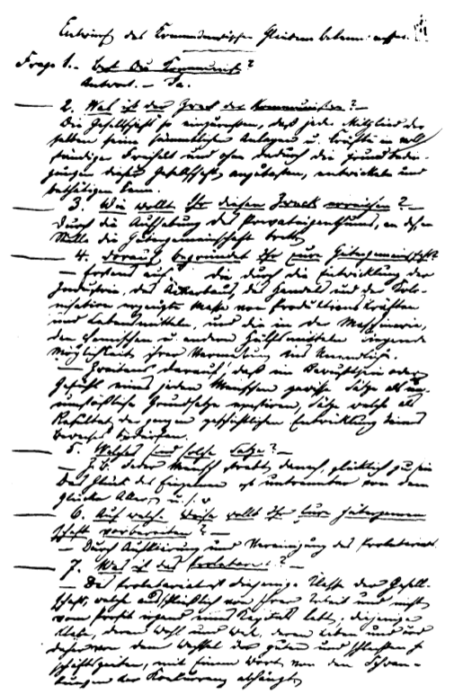 Manuscrito de Engels do primeiro rascunho do manifesto da Liga, ou Confissão de fé comunista. (MECW, v. 6.)
