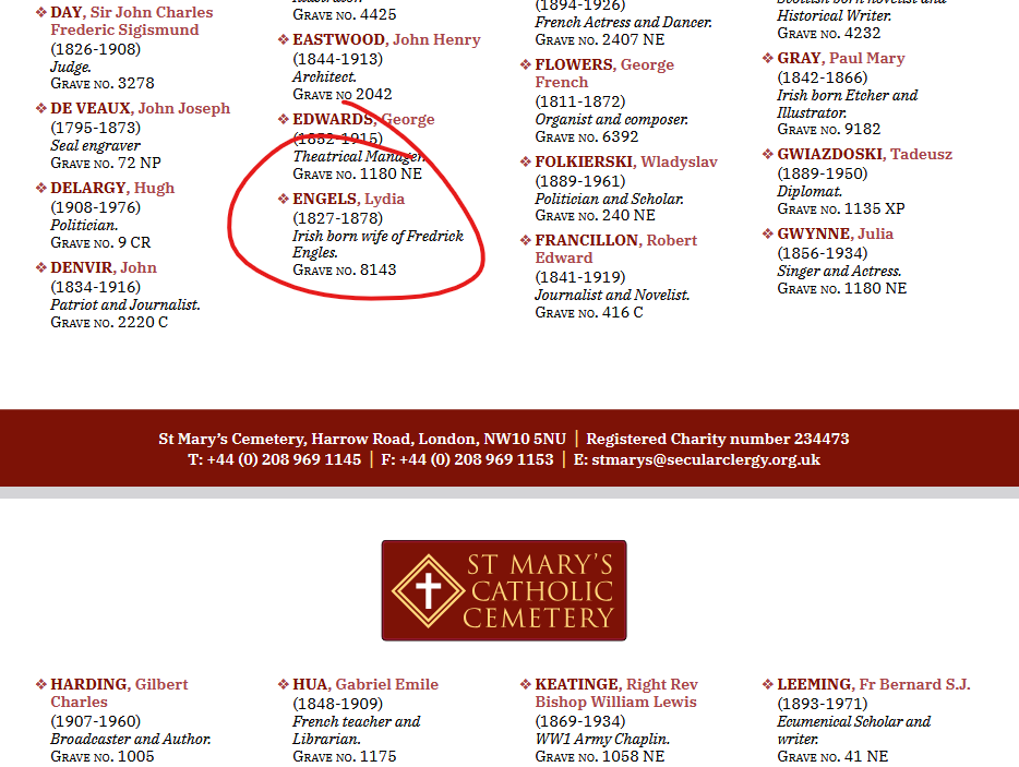 No entanto, há a evidência instigante do casamento e do enterro de Lizzie Burns. Certas formalidades e normas sociais “tradicionais” claramente importavam para ela, que claramente preferiu morrer como uma esposa do que como uma “mulher vivendo em pecado”. E um catolicismo de influência irlandesa permaneceu como parte integrante de tudo isso. As vidas de ambas as irmãs ilustram todas as contradições e as complexidades que existiam logo abaixo da superfície do simples rótulo de “irlandesa” no século XIX.