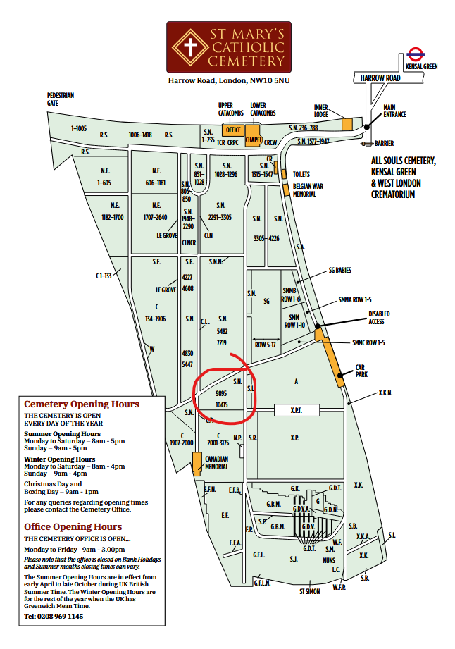 Print do catálogo de pessoas notáveis e de mapa do cemitério católico St. Mary, com destaque para Lizzie e para a localização da lápide dela.